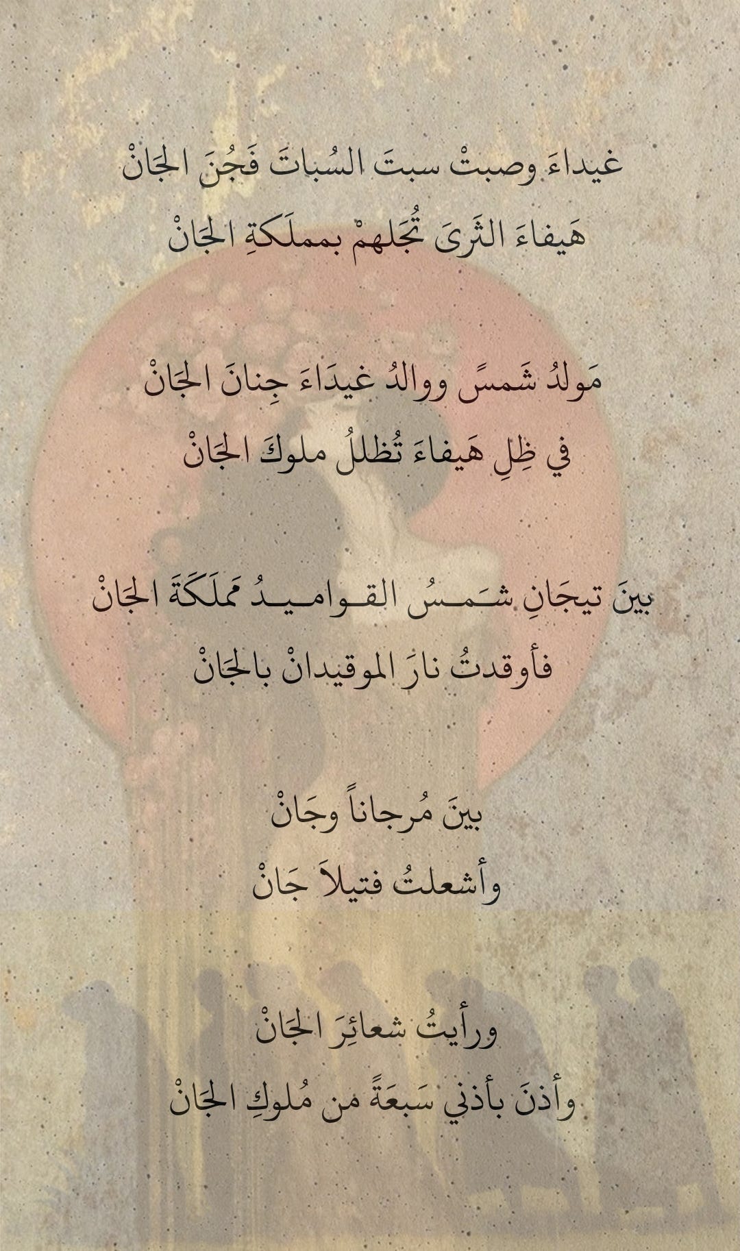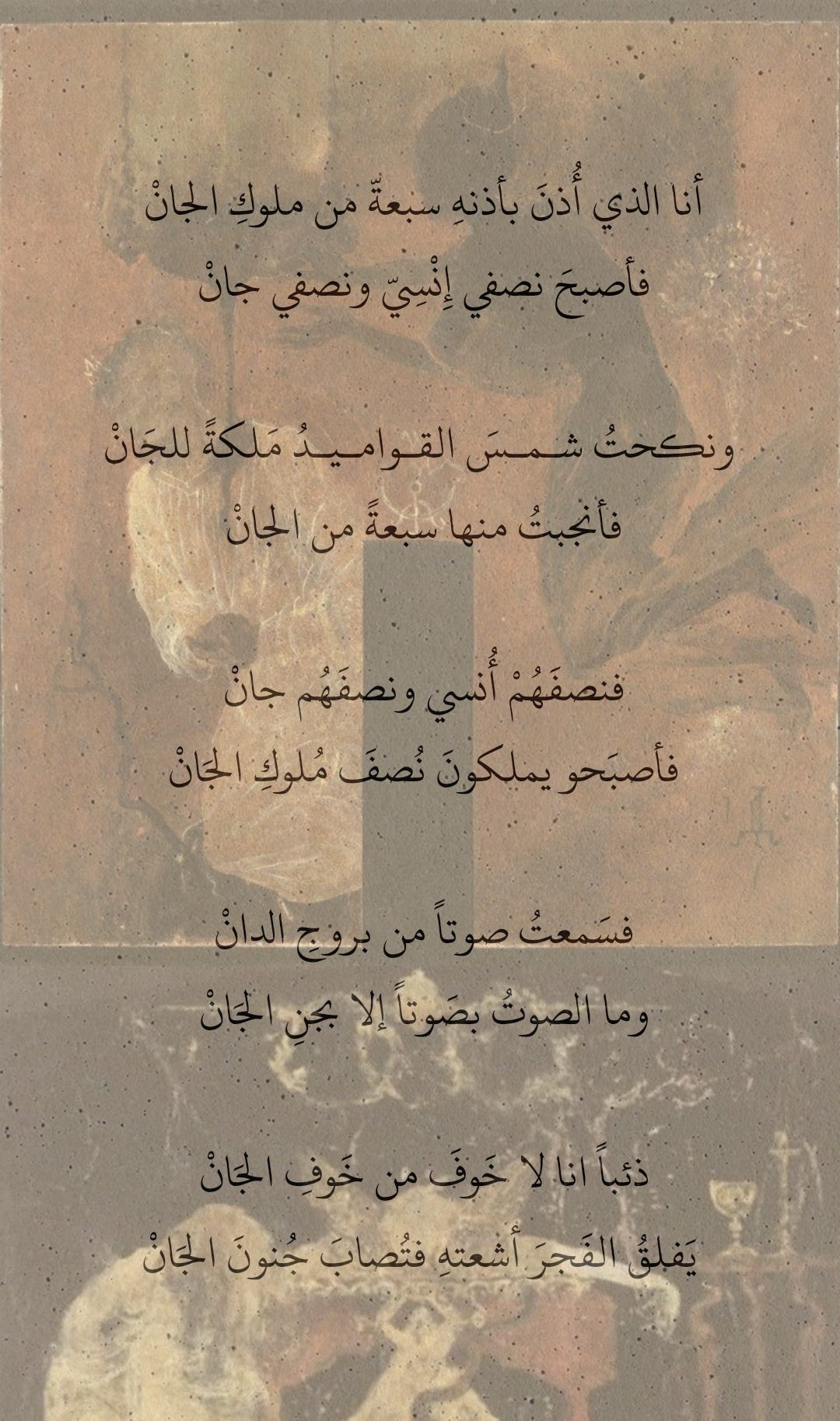 لمى قريت منشورك تذكرت القصيده هاذي :عَرَفَتْ ملوك الجن ريح عمامتي ونَكَحْتُ منهم سبعة وثمانية ودفنت قُرْطاً في صفيحة قَرْمَدٍ . وشربت من دم ذي الصواع بانية وتركت في واد السماوة أمةً لم يعن شيئا عنهم سلطانية